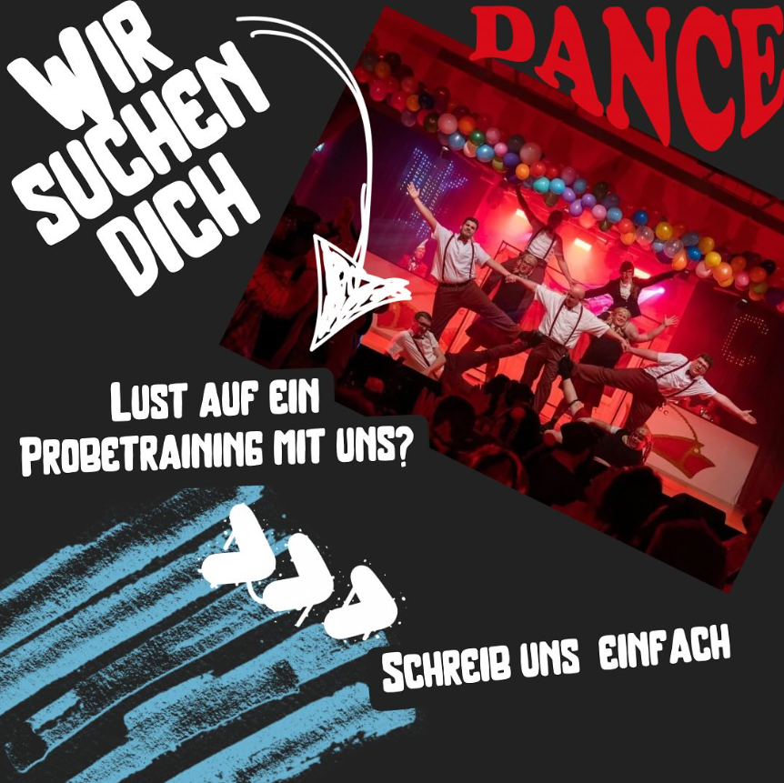 Du hast Bock auf ’ne geile Zeit, coole Auftritte und eine Truppe, bei der der Spaß nie zu kurz kommt? Dann bist du bei uns genau richtig! Egal ob du Tanzerfahrung hast oder einfach nur Lust, dich mal auf der Bühne auszuprobieren.
